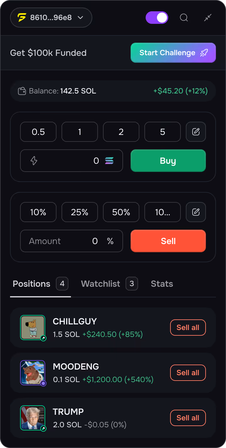 Compete for funded accounts up to $100,000. No payment required, trade exclusively on Solana Tap with a 3-day free challenge.