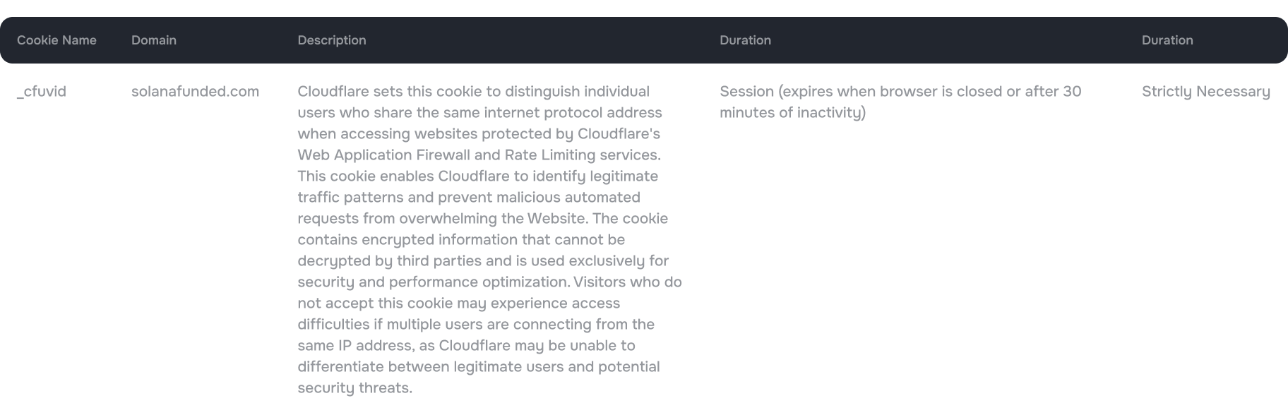 The _cfuvid cookie is technically a third-party cookie because it is set by Cloudflare rather than directly by Solana Funded. However, it is deployed exclusively to provide security and performance services that are integral to Website operation and is classified as strictly necessary.