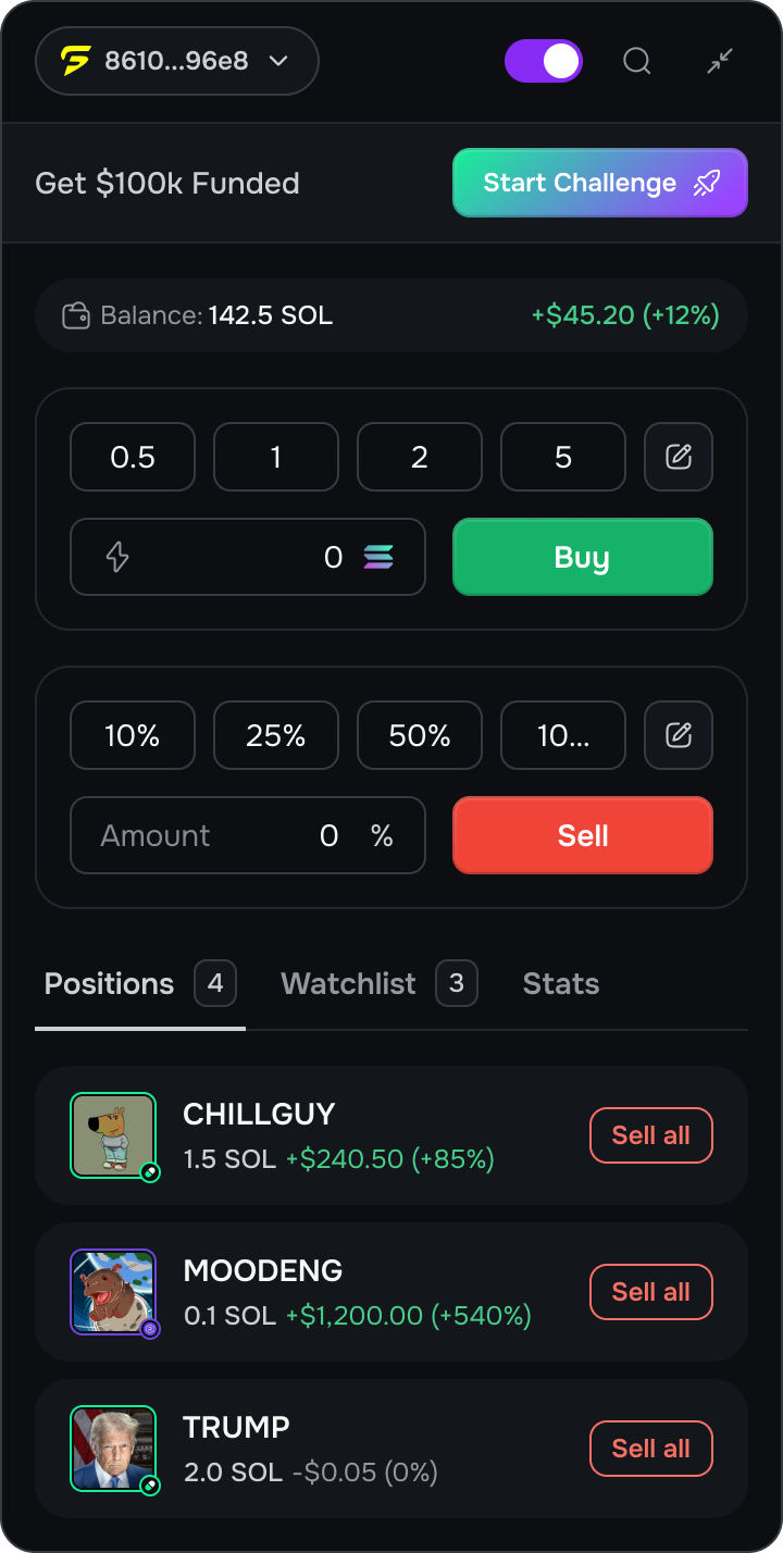 Keep using your favorite terminals. Our extension (Solana Tap) syncs your trades automatically to your funded account.